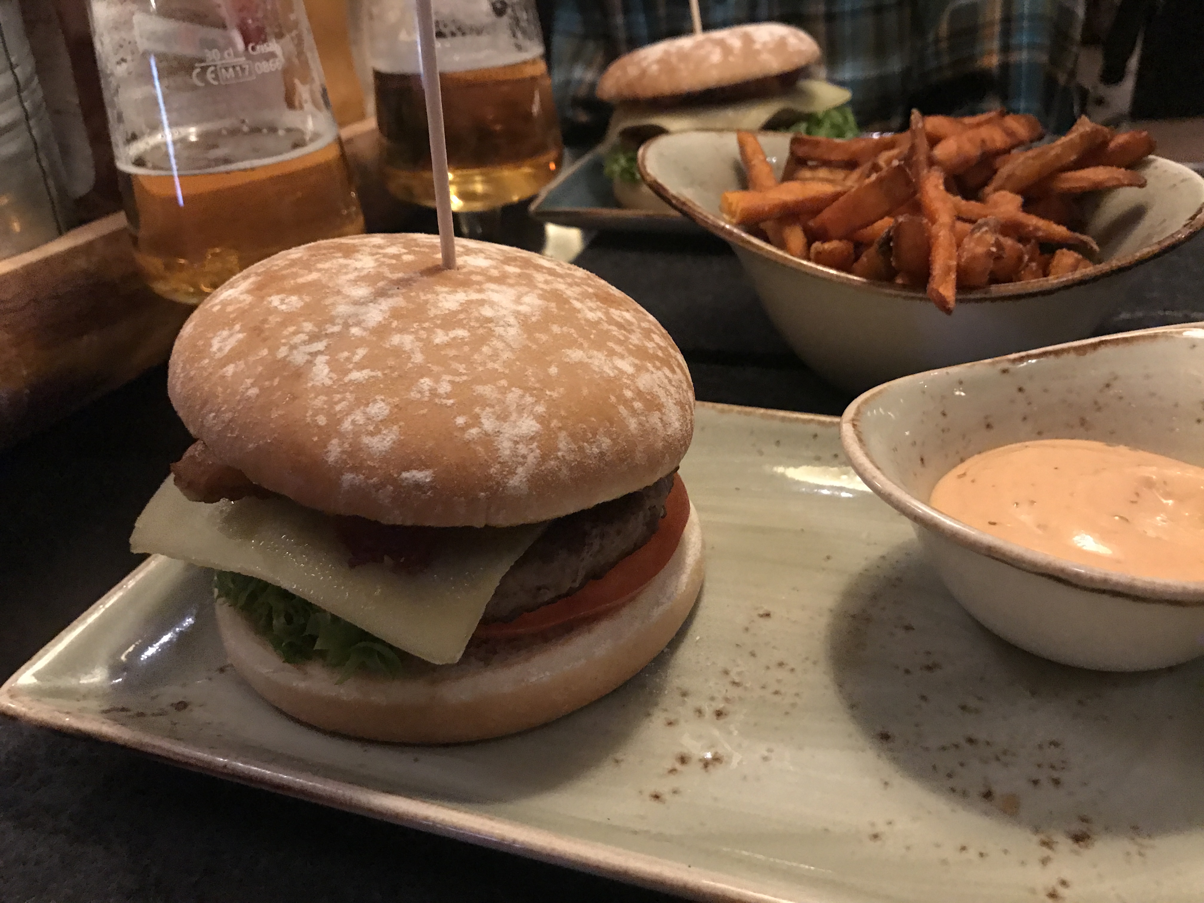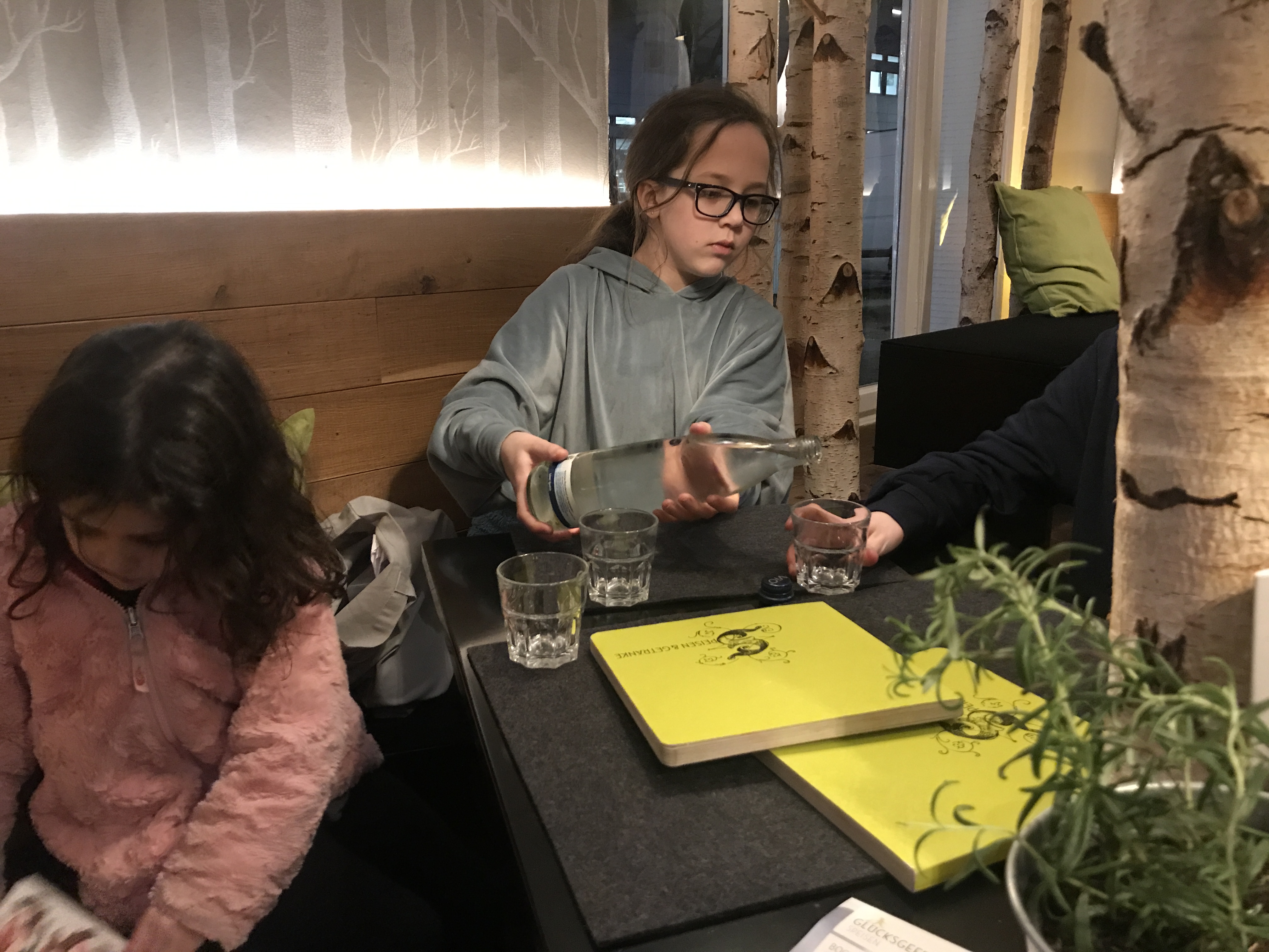 I might as well round out our day with a story about our walk to dinner. Littlest has been begging for burgers, so, thanks to a suggestion from Mattias, we found one about a 10 minute walk from our apartment. A little place called Hans im GlΓΌck: Burgergrill and Bar. Burgergrill for them: Bar for us. Everyone is happy. It was super cool. Lots of Aspen trees throughout the restaurant.